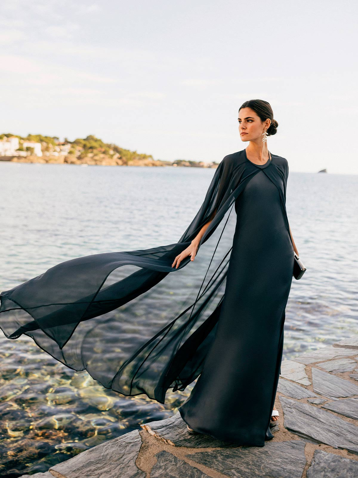 Der Umhang ist ein unverzichtbares Kleidungsstück der neuen Kollektion, das jedem Outfit einen Hauch von leichter und zeitloser Raffinesse verleiht. Er ist aus hochwertigem Chiffon gefertigt und zeichnet sich durch seinen langen Schnitt mit U-Boot-Ausschnitt und zentralem Schlitz aus, der fließende Bewegung und eine elegante Ästhetik bietet. Dieser Umhang ist perfekt, um Kleider oder formelle Looks aufzuwerten und verleiht ihnen einen Hauch von Besonderheit, ohne dabei auf Komfort und Stil zu verzichten.