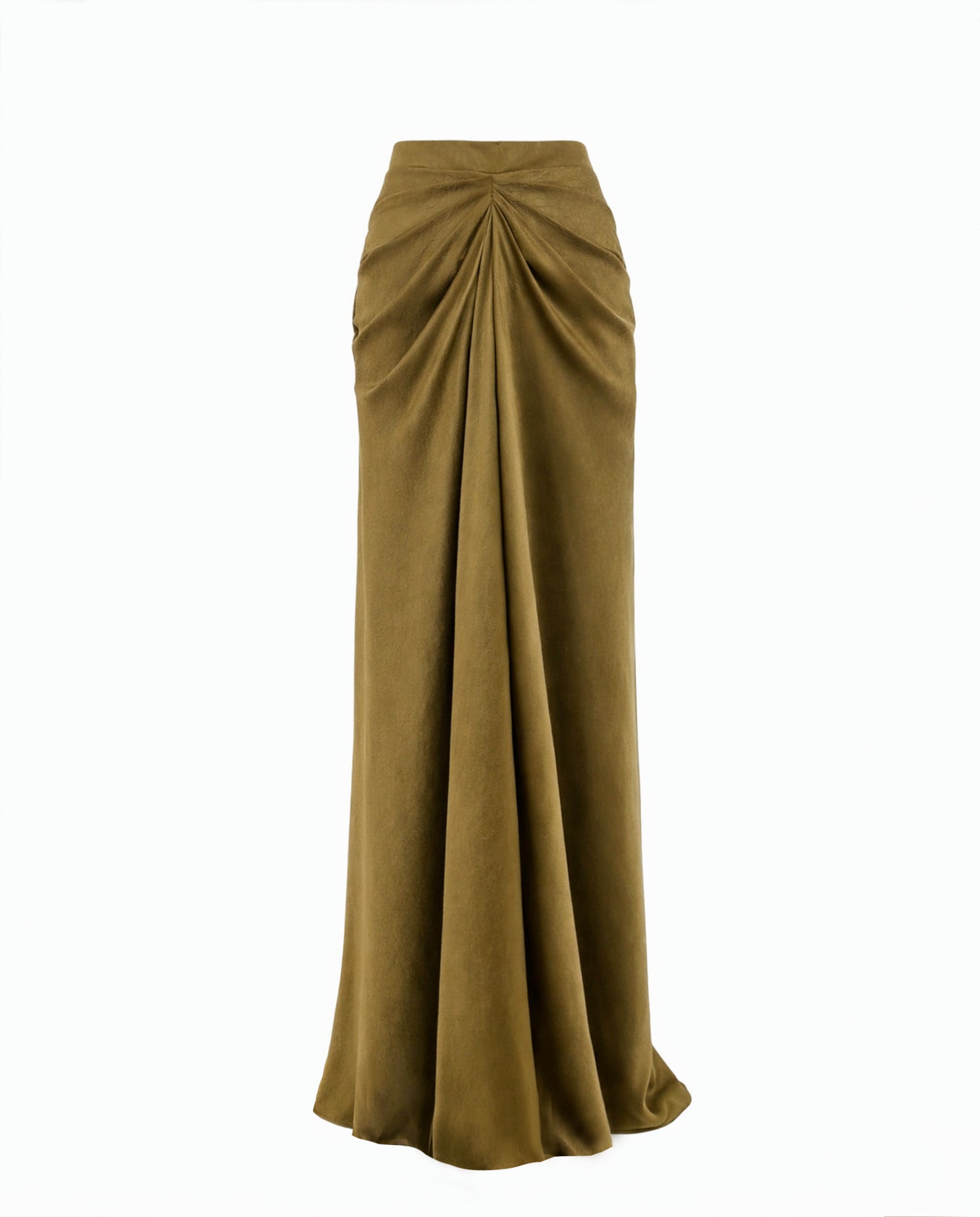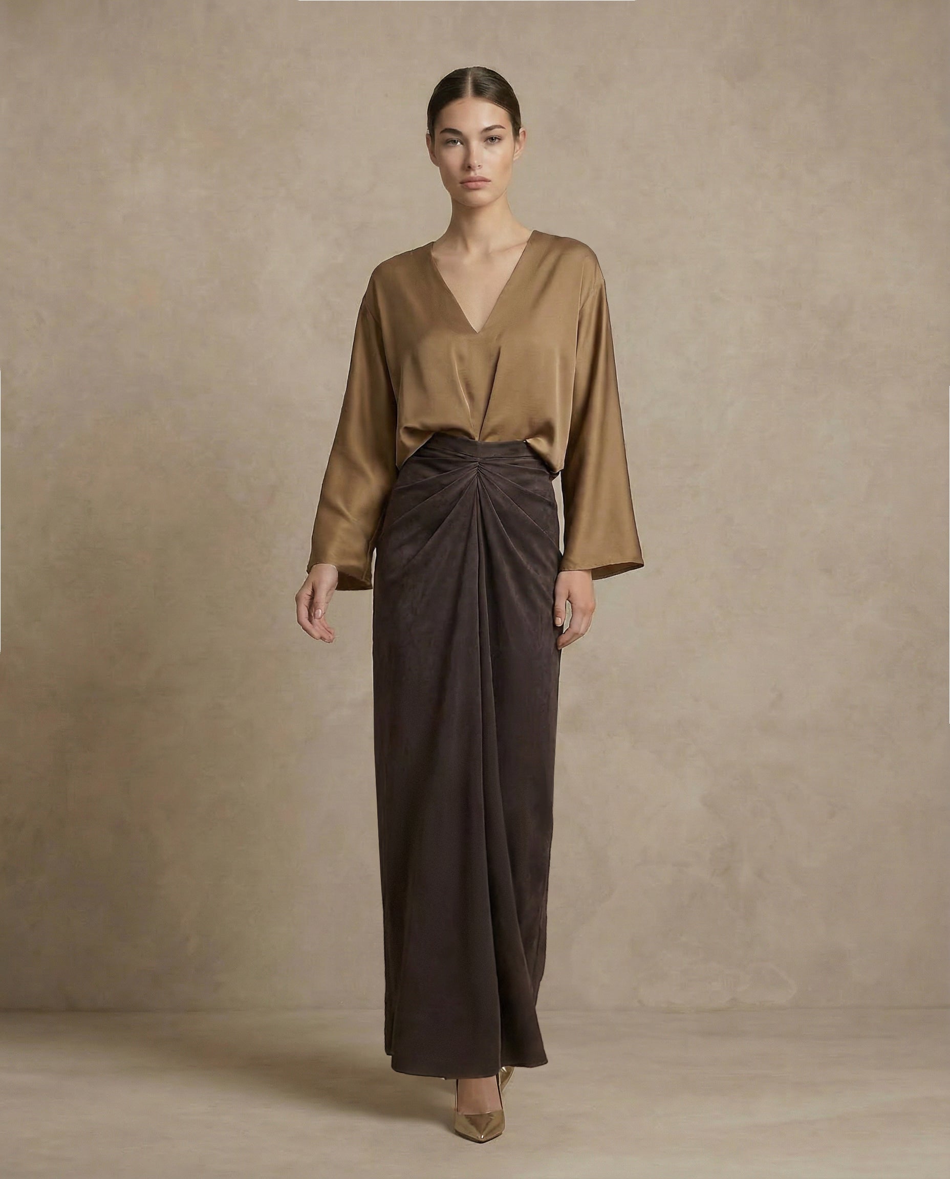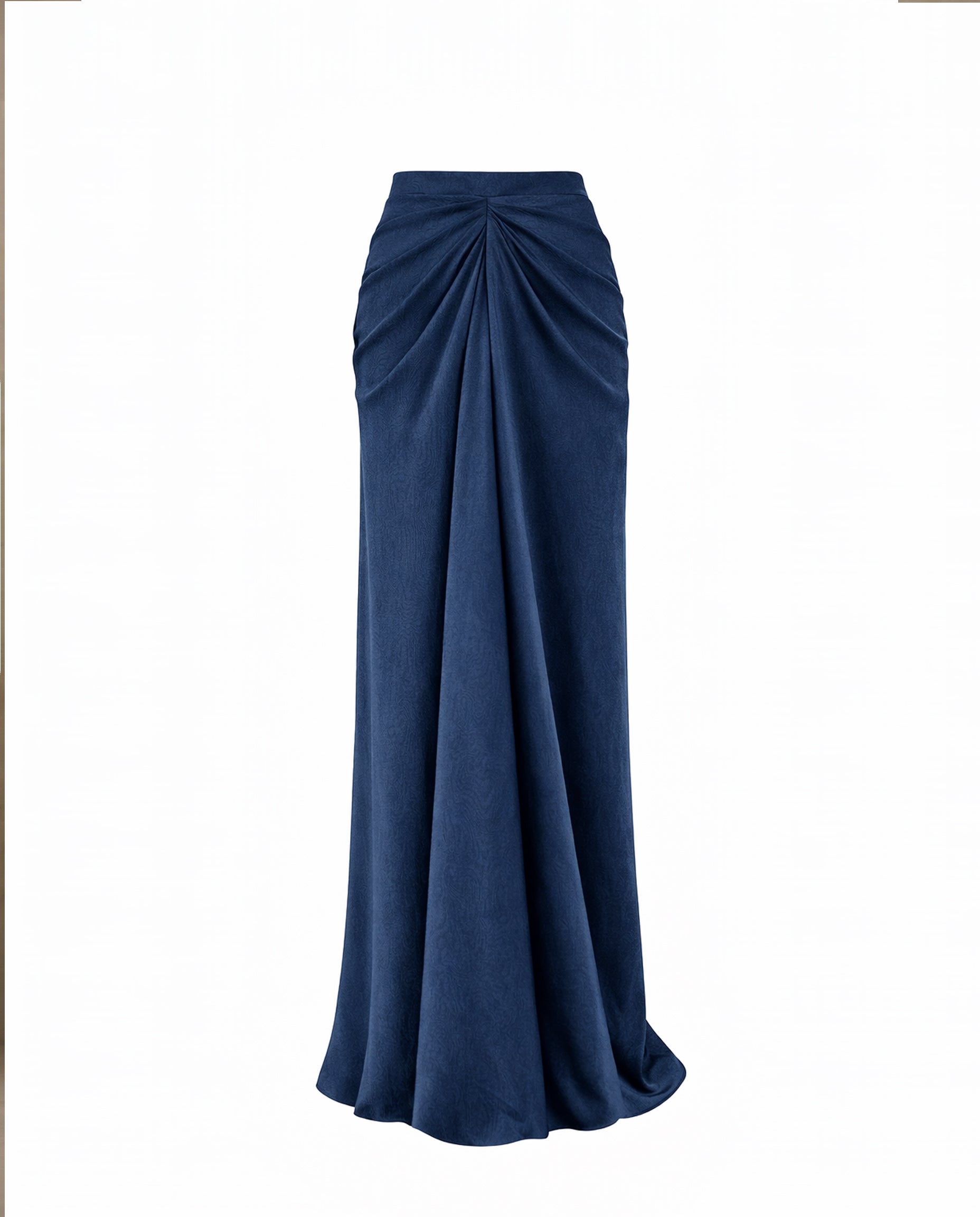 Leire drapierter langer Rock, ein elegantes und raffiniertes Kleidungsstück, das jeden Look aufwertet. Seine zarte Drapierung verleiht Textur und Stil, während seine schmeichelhafte Länge ihn zu einem vielseitigen Stück macht, das sich gut mit Blusen oder Tops kombinieren lässt. Perfekt für formelle Anlässe oder Feierlichkeiten. Leire ist ein Rock, der Komfort und Stil vereint.