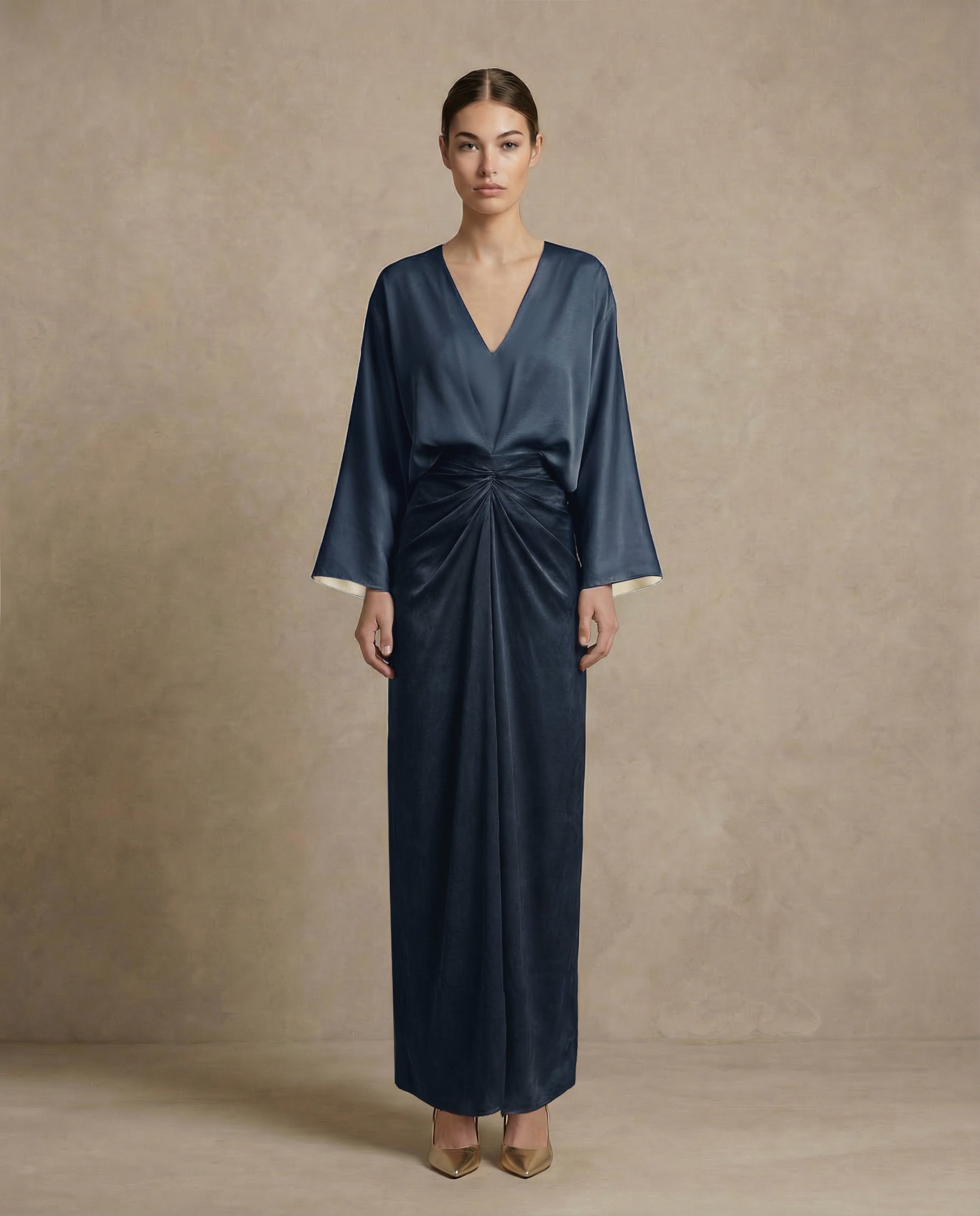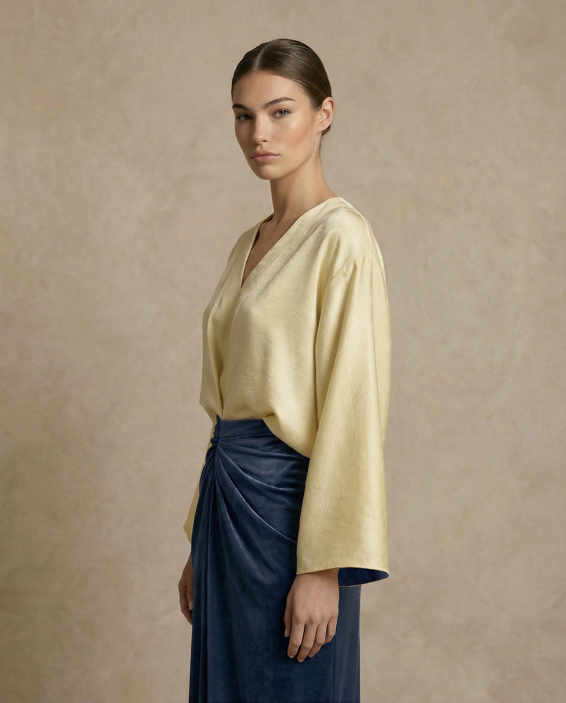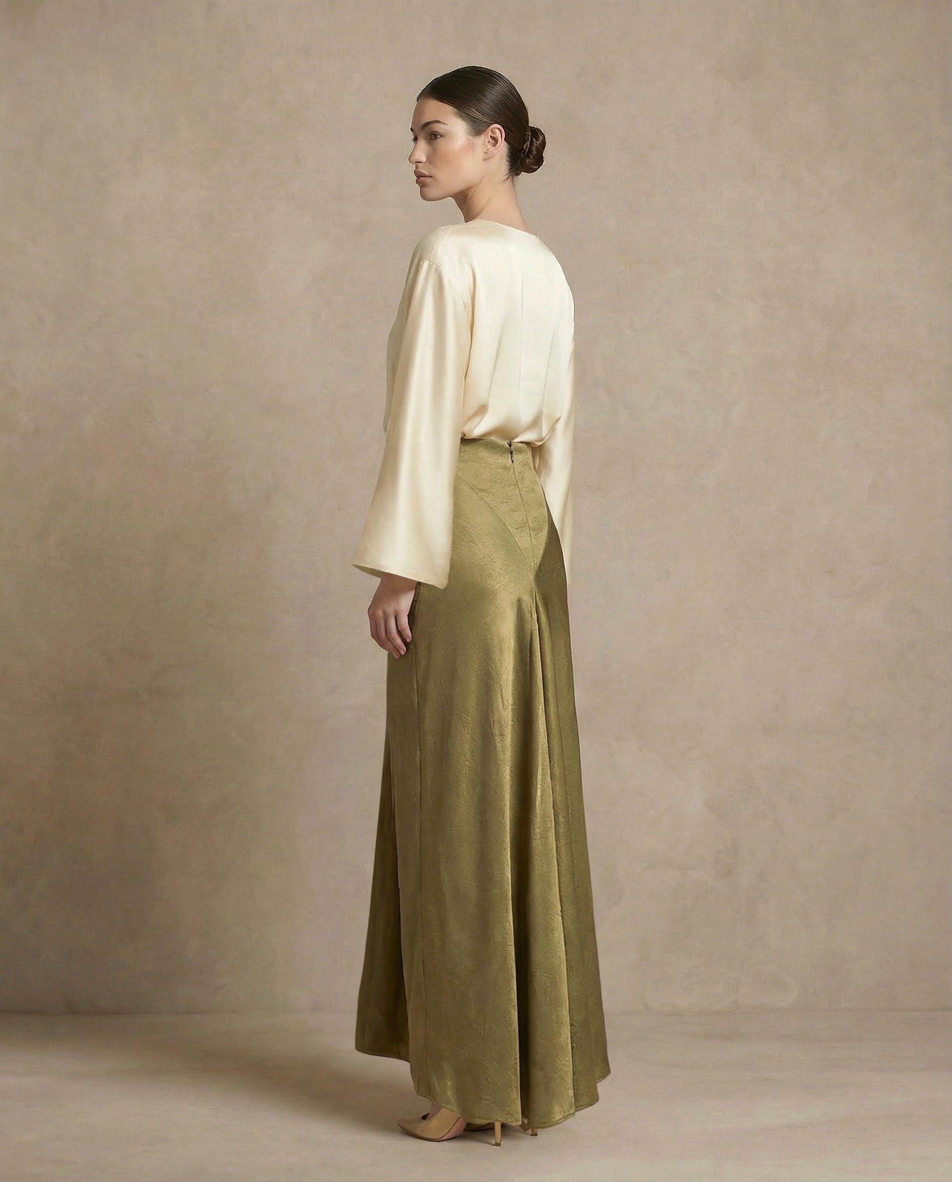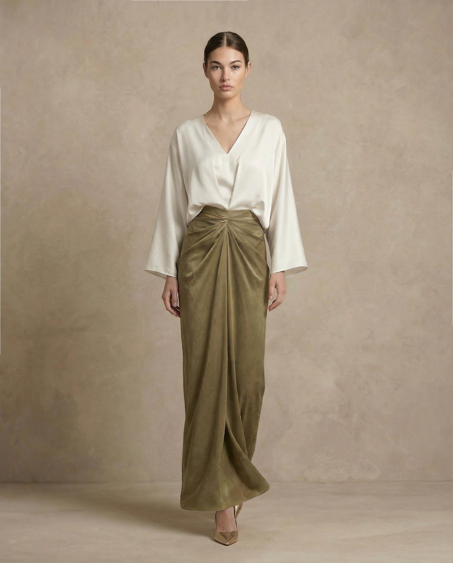 Leire drapierter langer Rock, ein elegantes und raffiniertes Kleidungsstück, das jeden Look aufwertet. Seine zarte Drapierung verleiht Textur und Stil, während seine schmeichelhafte Länge ihn zu einem vielseitigen Stück macht, das sich gut mit Blusen oder Tops kombinieren lässt. Perfekt für formelle Anlässe oder Feierlichkeiten. Leire ist ein Rock, der Komfort und Stil vereint.