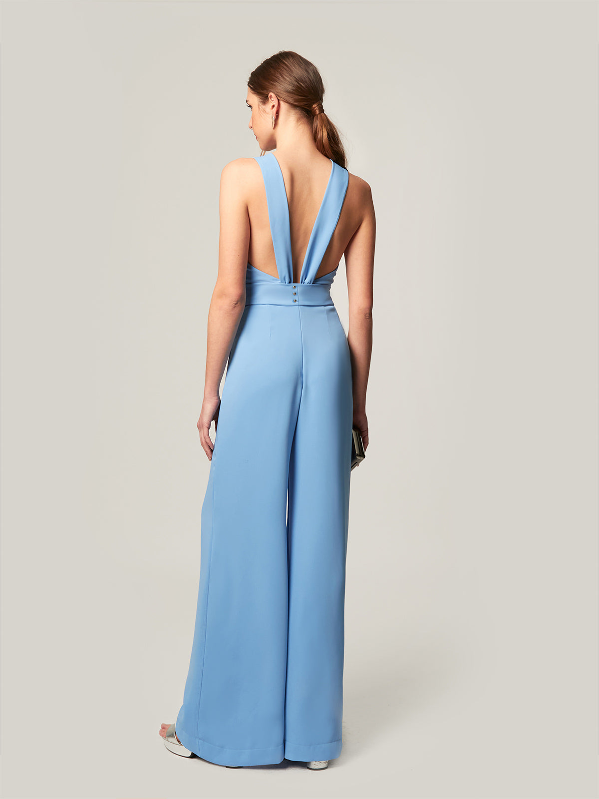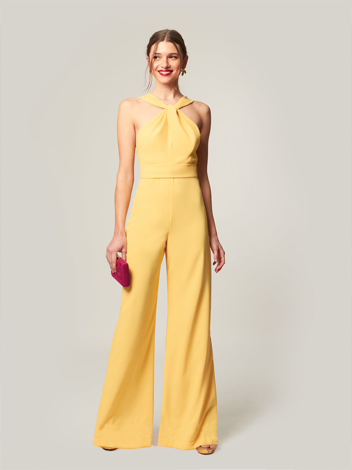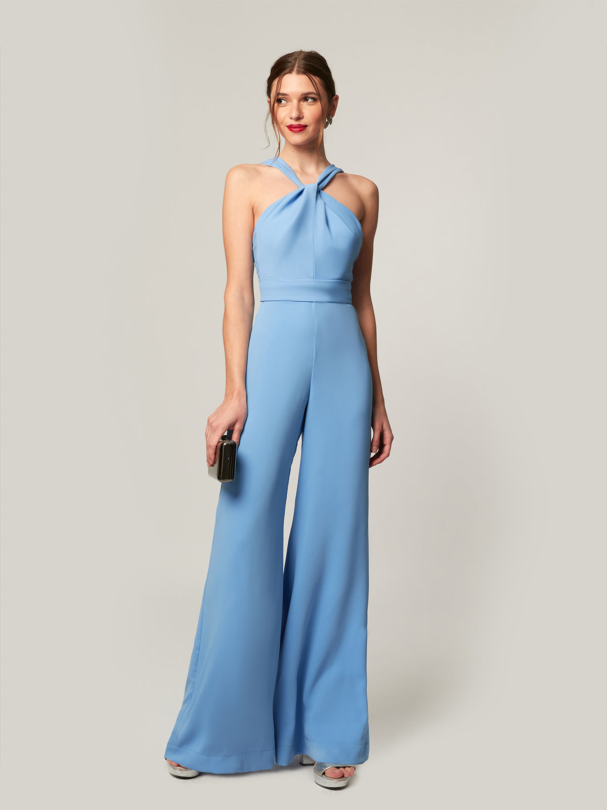 Der Overall Amalia ist ein vielseitiges und raffiniertes Kleidungsstück, das Eleganz und Komfort in einem einzigen Stück vereint und sich ideal für Ihre Tagesveranstaltungen oder Abendfeiern eignet. Mit einem geknoteten Kragen auf der Vorderseite und einem offenen Rücken mit geraden Trägern verleiht sein Design dem Ensemble eine feminine und moderne Note und betont die Figur mit Anmut. Der untere Teil der Palazzohose bietet einen fließenden und schmeichelhaften Fall, der die Silhouette streckt und eine ausgewogene und selbstbewusste Ästhetik schafft. Ein perfektes Stück, um es allein zu tragen oder mit Accessoires für einen kompletten und raffinierten Look zu kombinieren, der sich stilvoll an verschiedene Anlässe anpasst.