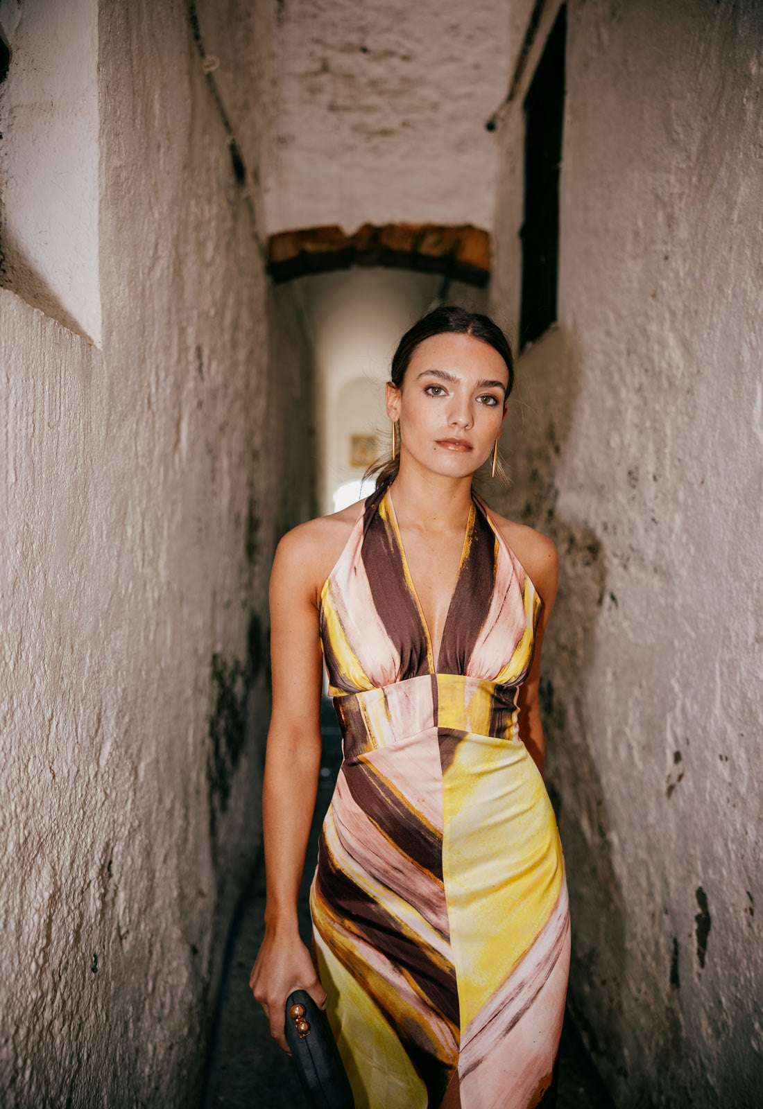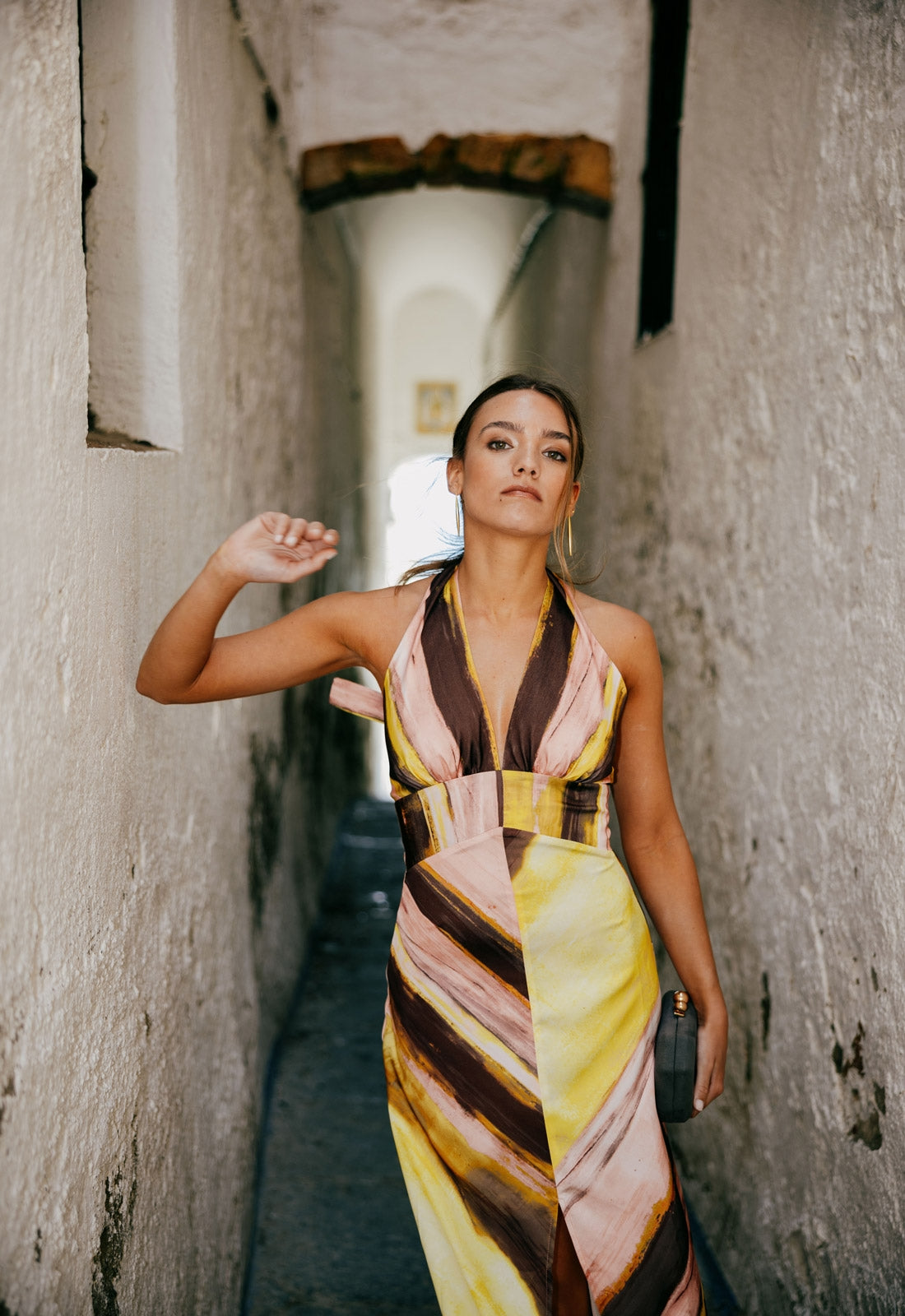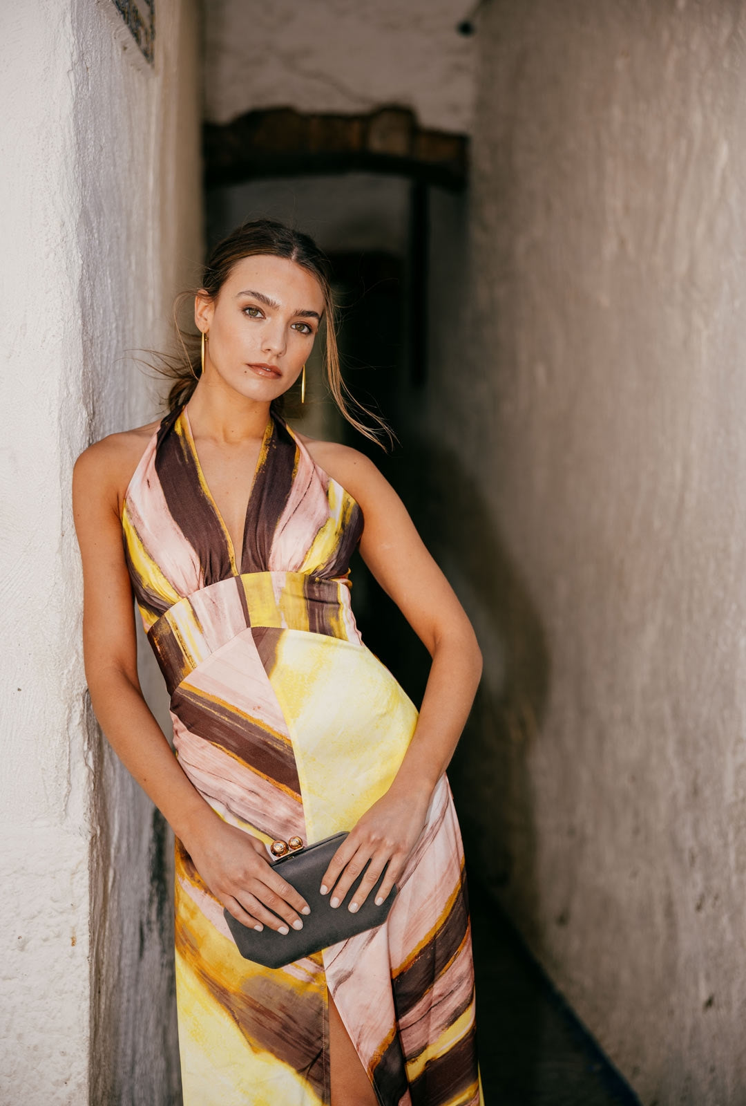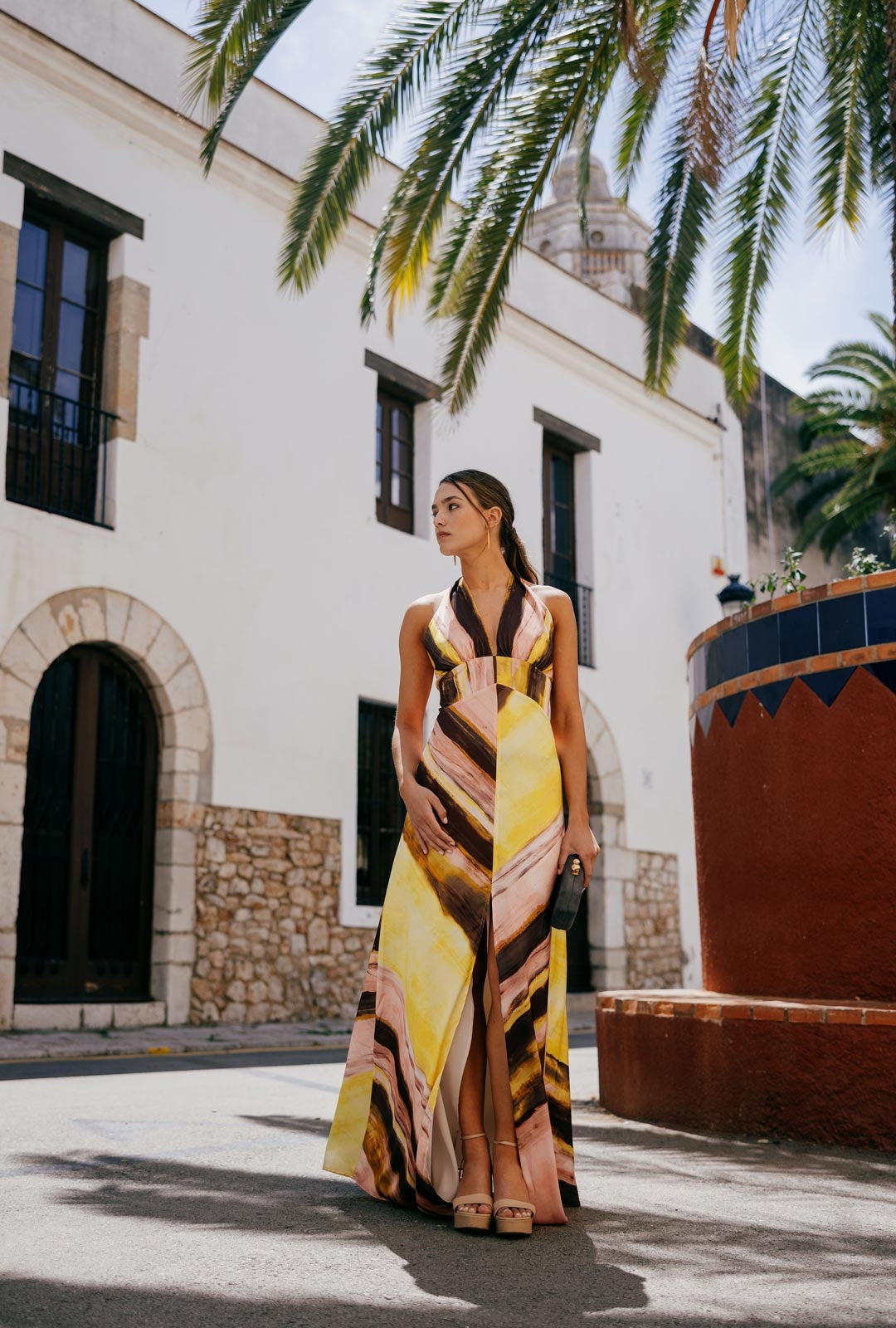 Das Kleid Adele ist ein Stück anspruchsvoller Weiblichkeit und zeitlosem Stil, entworfen, um bei Ihren besonderen Anlässen mit Präsenz zu glänzen. Als langes bedrucktes Kleid mit V-Ausschnitt gefertigt, betont die definierte Taille die Figur vorteilhaft, während der ausgestellte Rock mit zentralem Schlitz beim Gehen Bewegung und Eleganz verleiht. Am Rücken wird es mit zwei Bändern gebunden, was dem Design ein zartes und raffiniertes Detail hinzufügt, das Modernität mit einem romantischen Touch ausbalanciert. Eine ideale Wahl für Hochzeiten, Tages- oder Abendfeiern, bei denen Stil und Raffinesse im Vordergrund stehen.