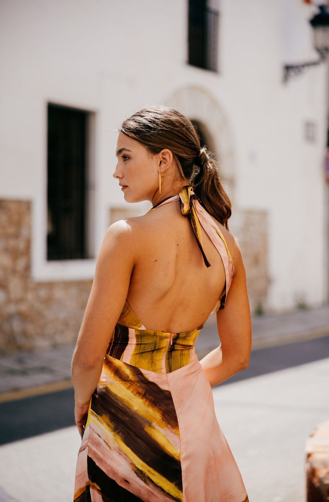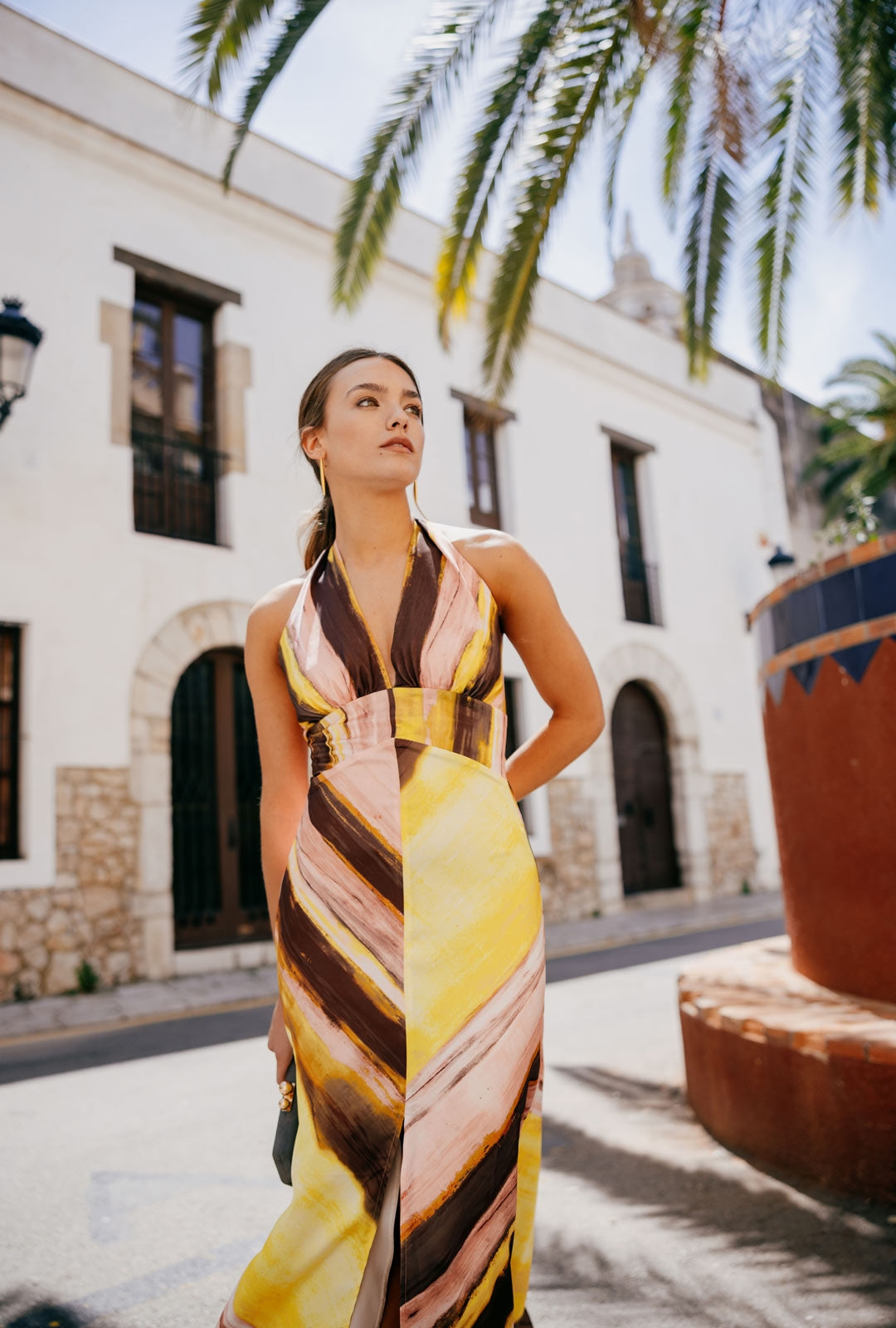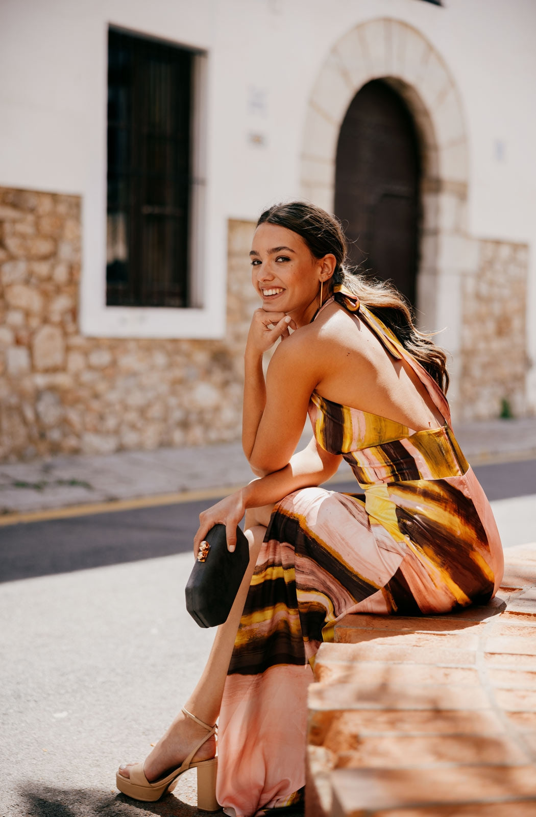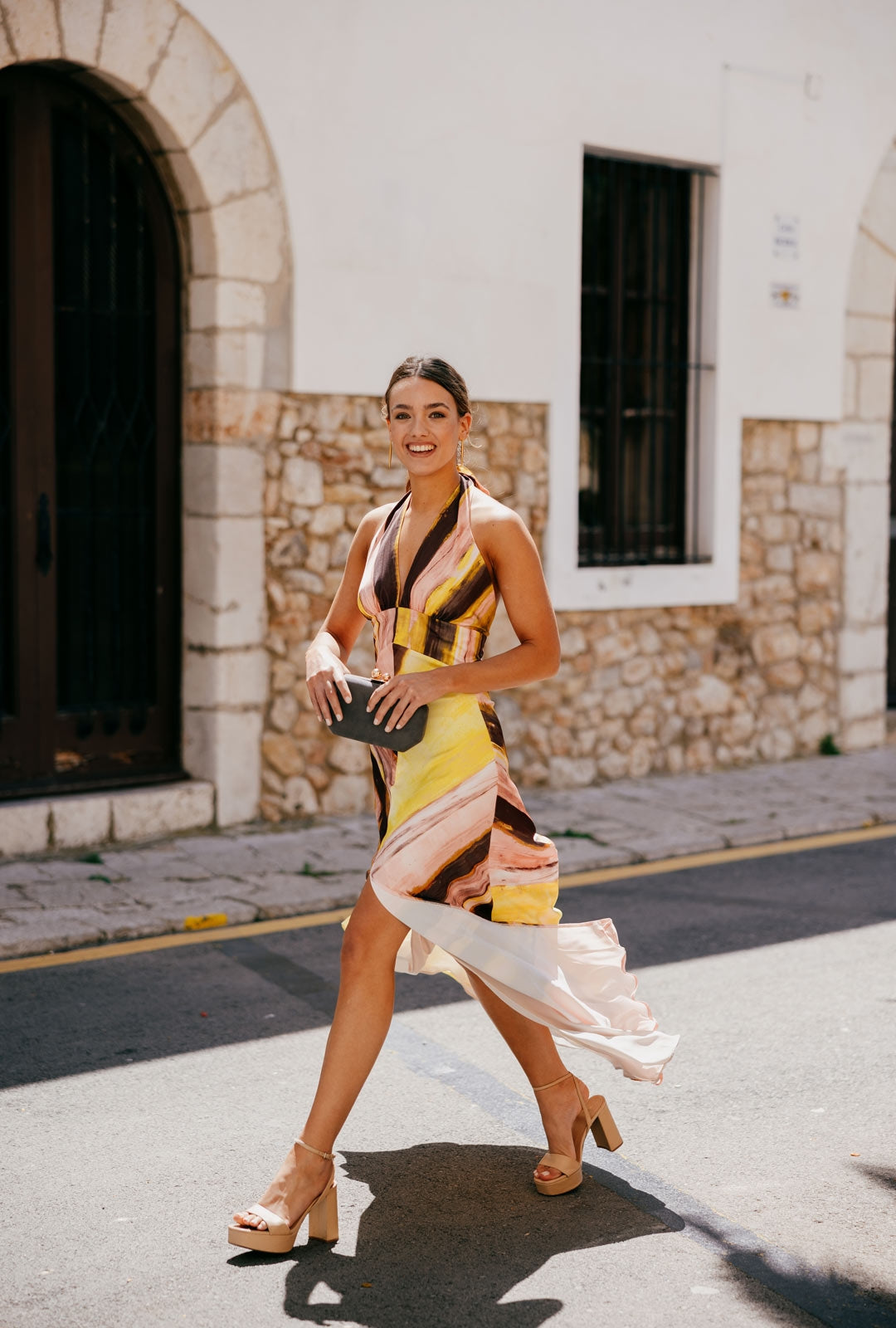 Das Kleid Adele ist ein Stück anspruchsvoller Weiblichkeit und zeitlosem Stil, entworfen, um bei Ihren besonderen Anlässen mit Präsenz zu glänzen. Als langes bedrucktes Kleid mit V-Ausschnitt gefertigt, betont die definierte Taille die Figur vorteilhaft, während der ausgestellte Rock mit zentralem Schlitz beim Gehen Bewegung und Eleganz verleiht. Am Rücken wird es mit zwei Bändern gebunden, was dem Design ein zartes und raffiniertes Detail hinzufügt, das Modernität mit einem romantischen Touch ausbalanciert. Eine ideale Wahl für Hochzeiten, Tages- oder Abendfeiern, bei denen Stil und Raffinesse im Vordergrund stehen.