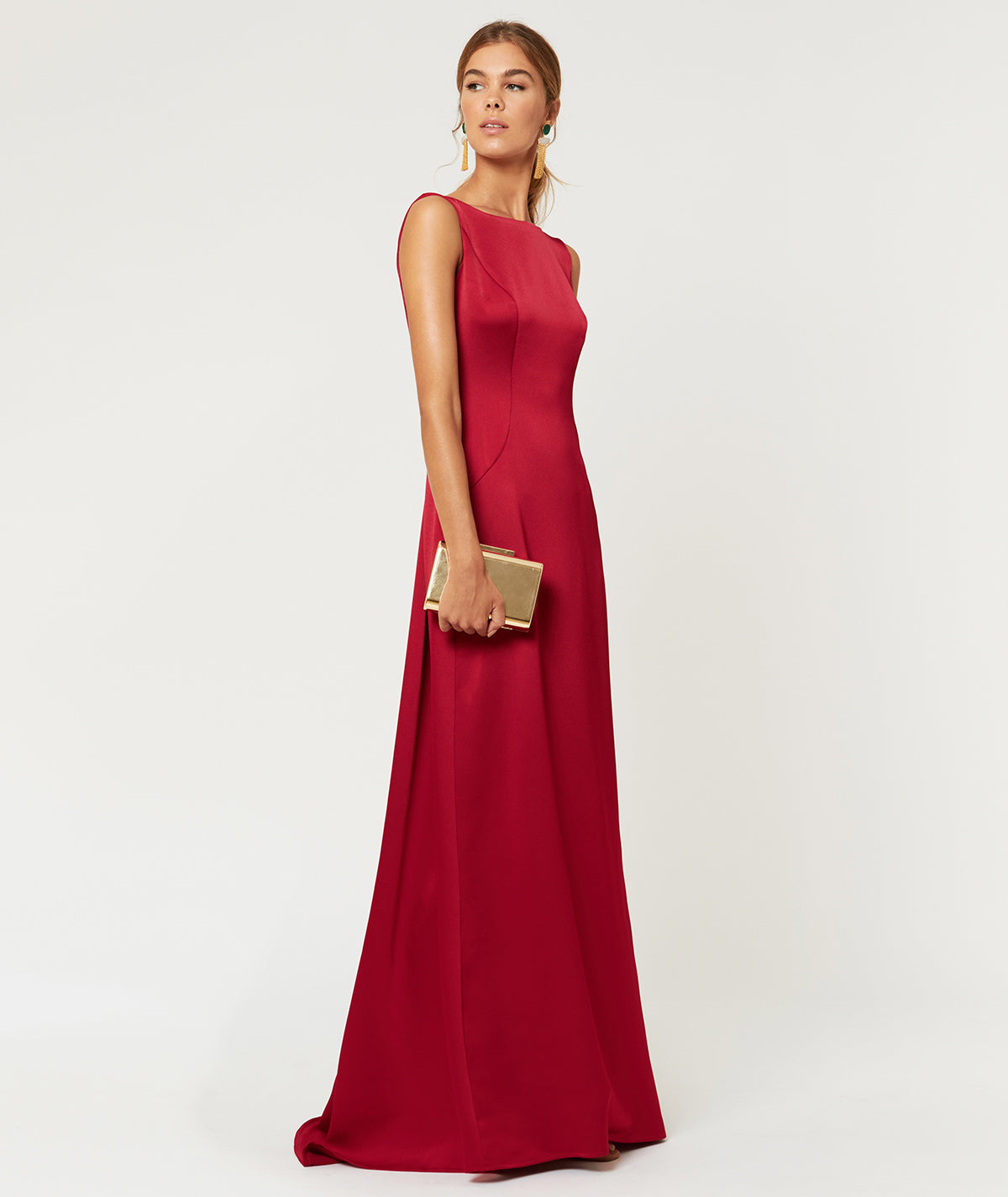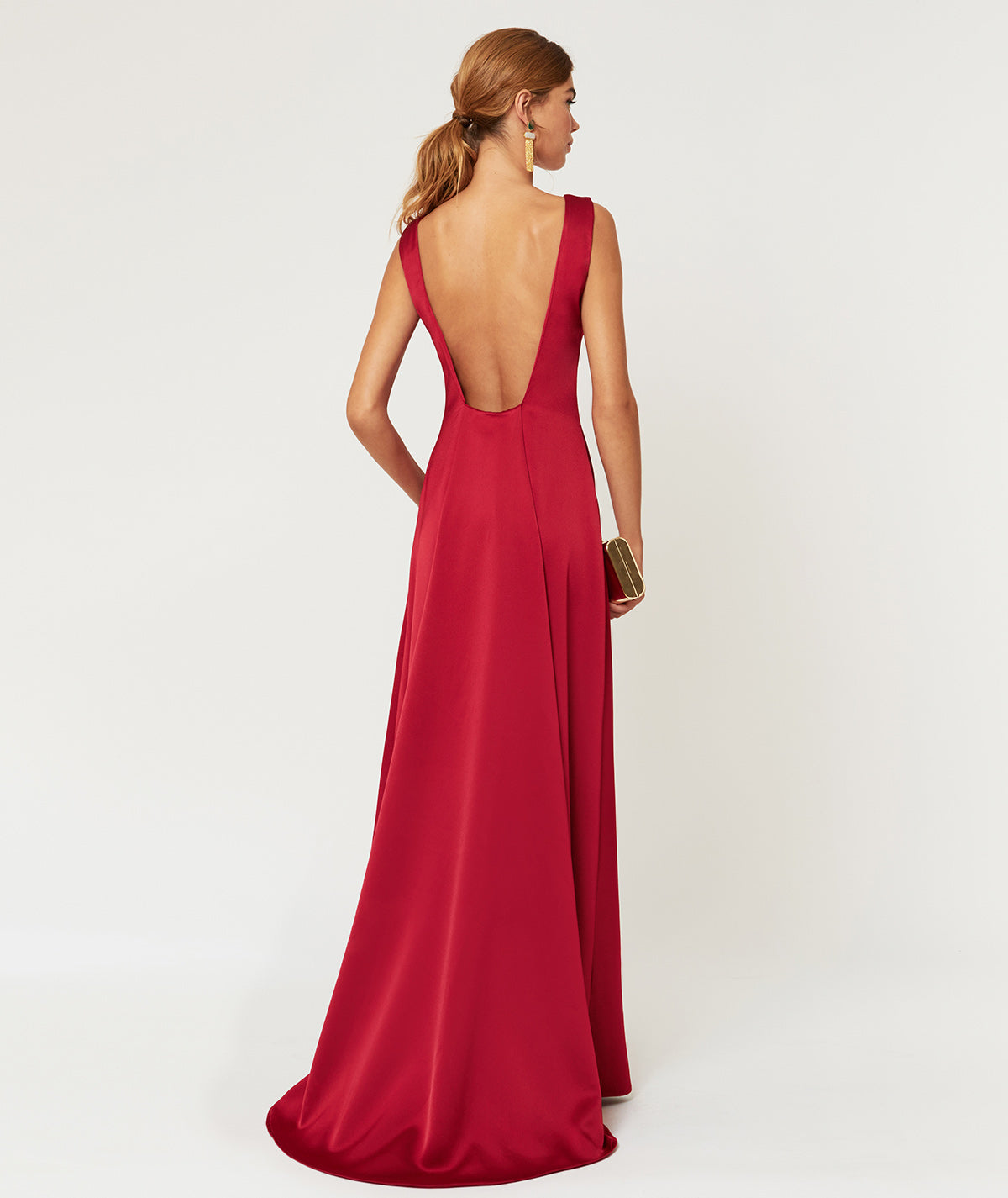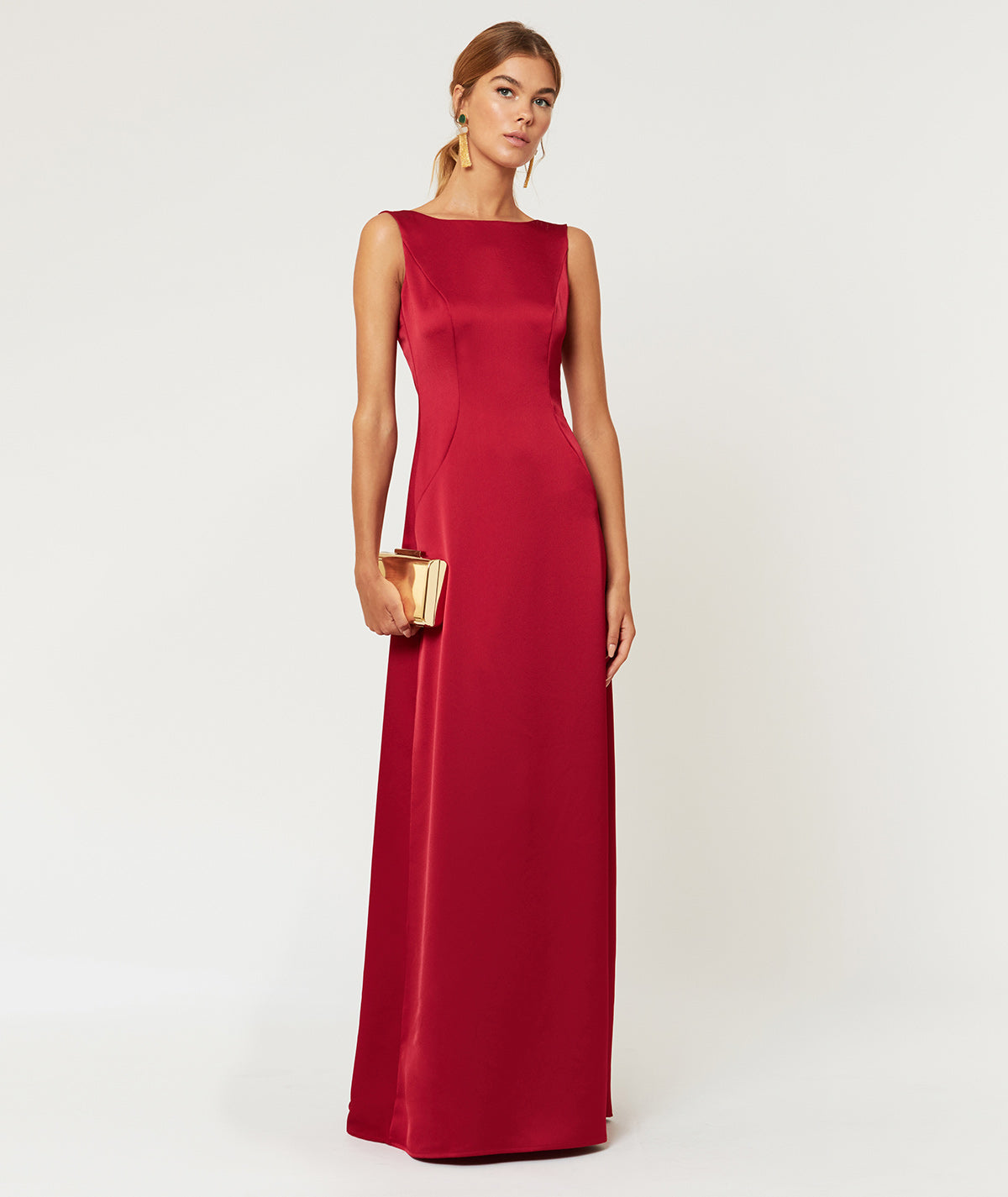 Langes, ärmelloses Satinkleid mit offenem Rücken, das einen raffinierten und femininen Touch verleiht. Sein fließender und eleganter Stoff betont die Silhouette und macht es zur perfekten Wahl für Hochzeiten am Abend und besondere Anlässe. Ein Kleid, das dazu entworfen wurde, mit Stil und Eleganz zu beeindrucken.