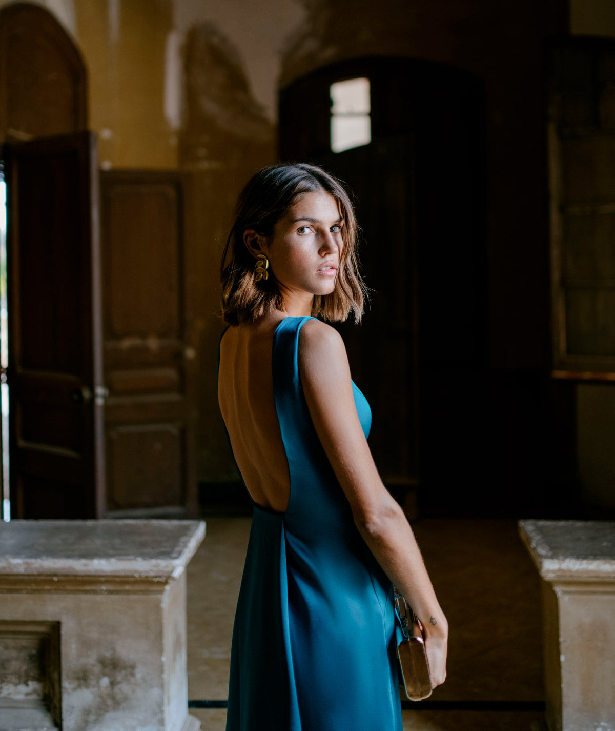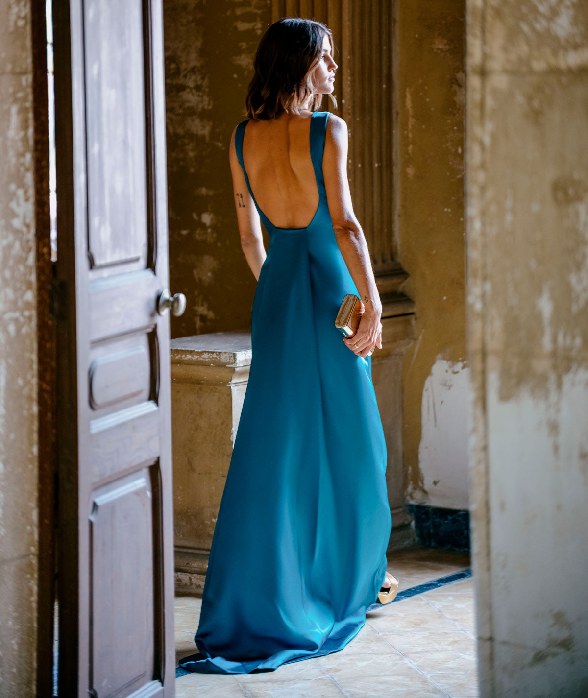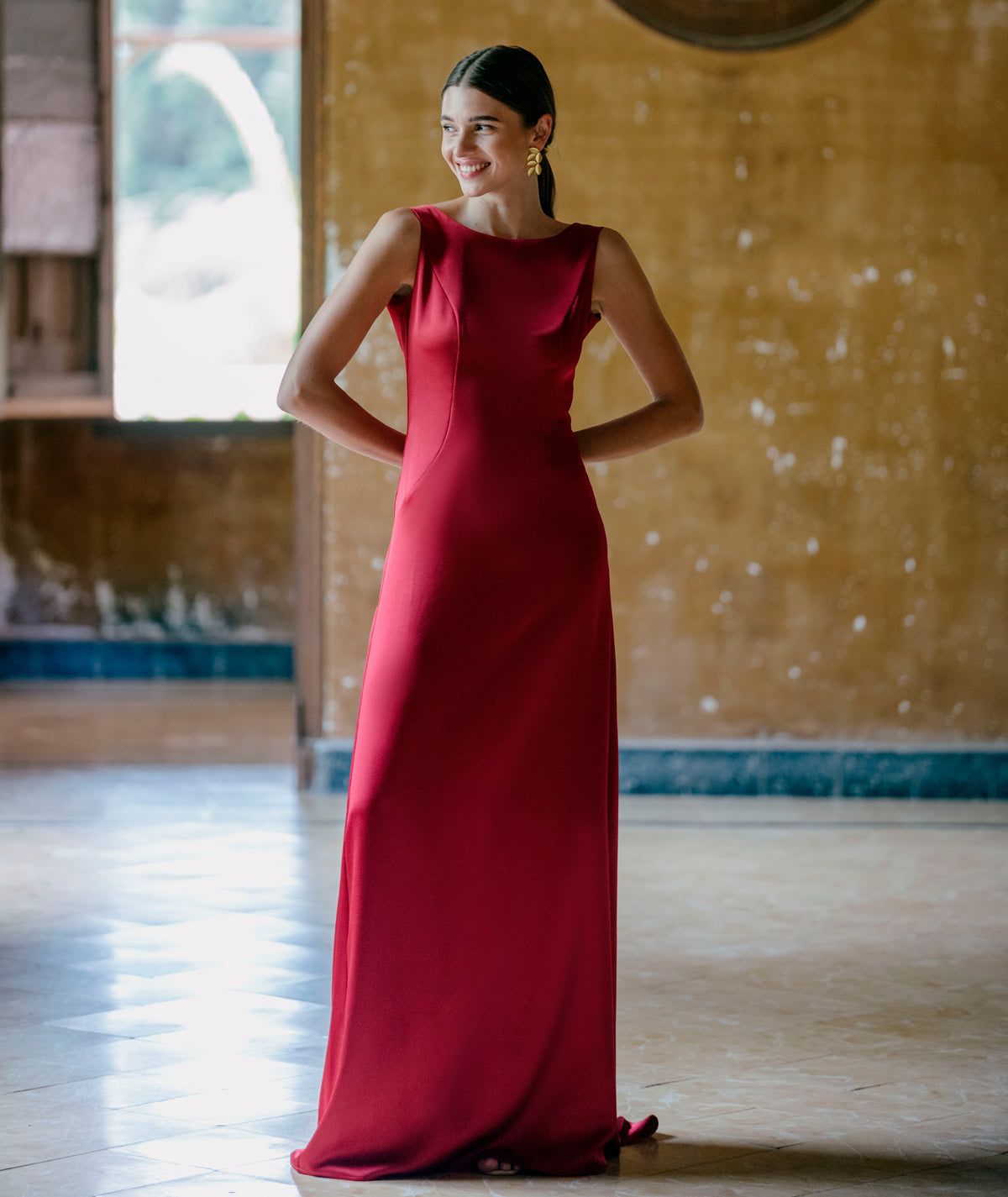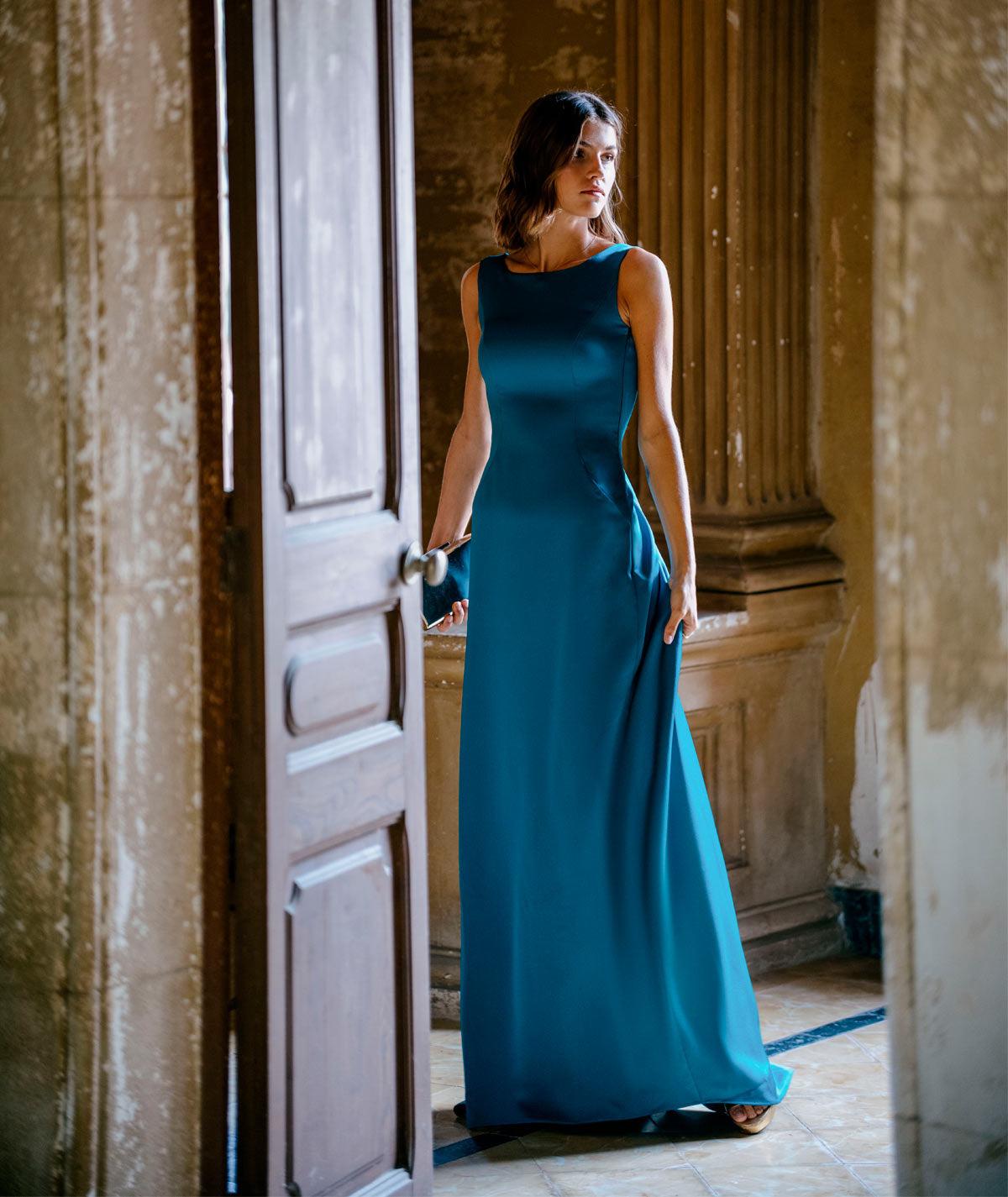 Langes, ärmelloses Satinkleid mit offenem Rücken, das einen raffinierten und femininen Touch verleiht. Sein fließender und eleganter Stoff betont die Silhouette und macht es zur perfekten Wahl für Hochzeiten am Abend und besondere Anlässe. Ein Kleid, das dazu entworfen wurde, mit Stil und Eleganz zu beeindrucken.