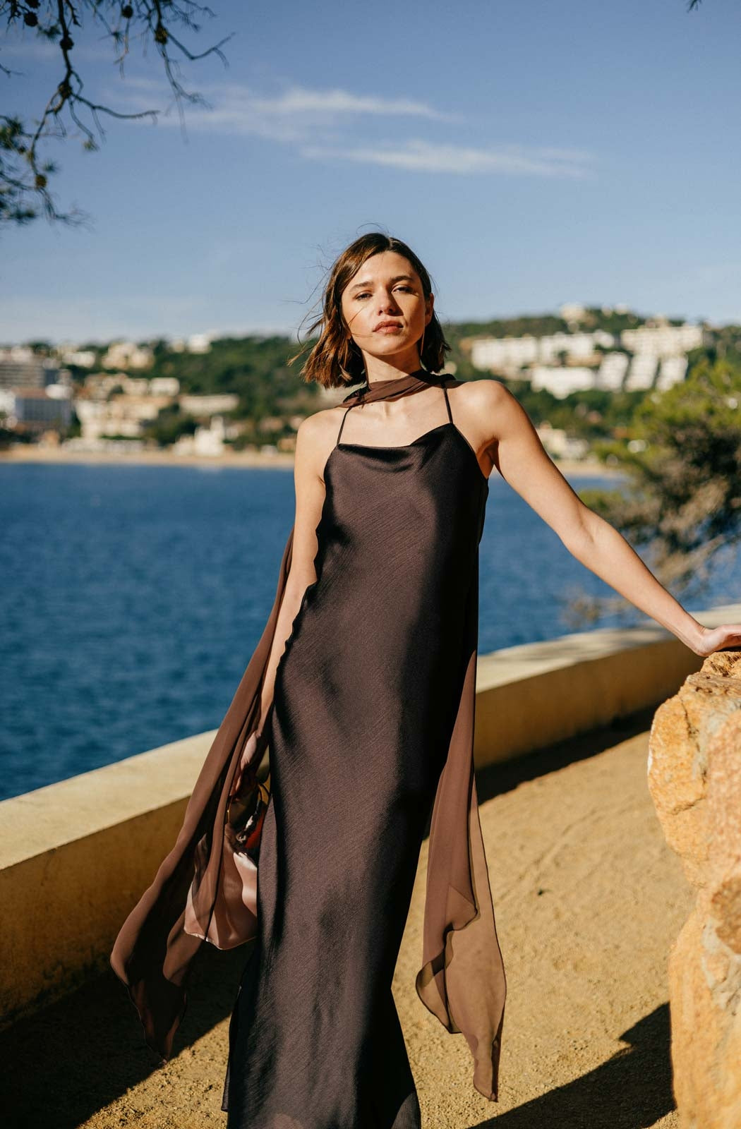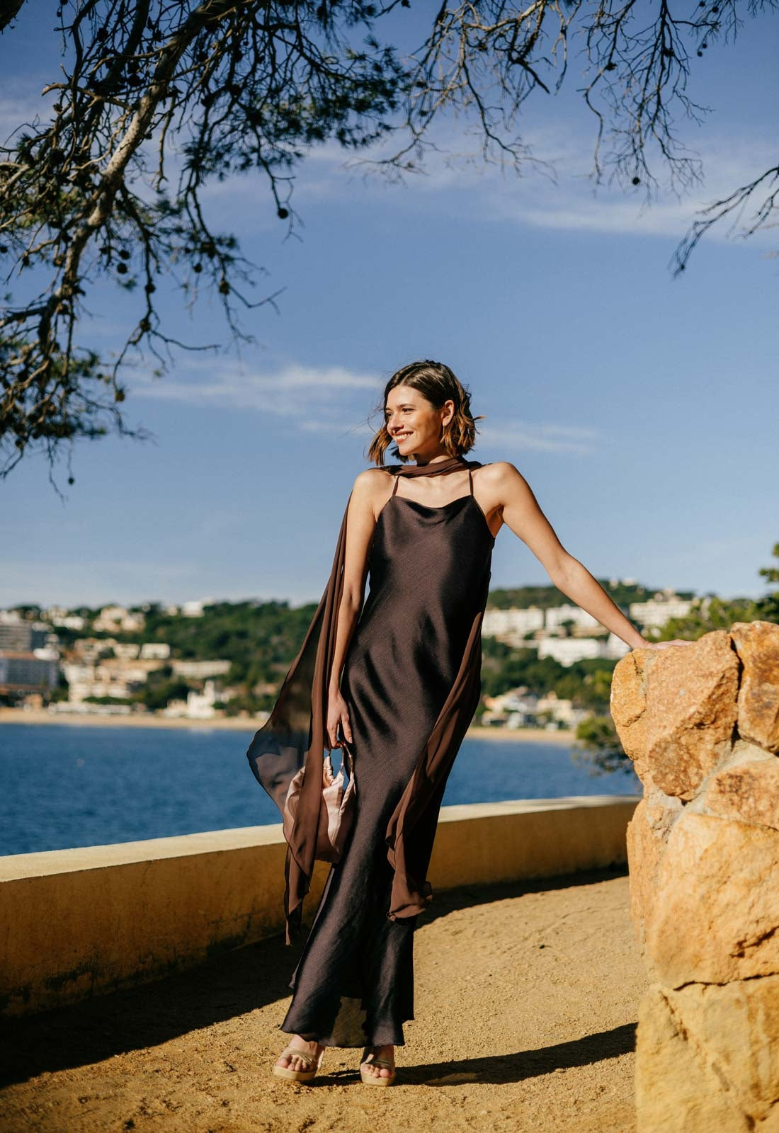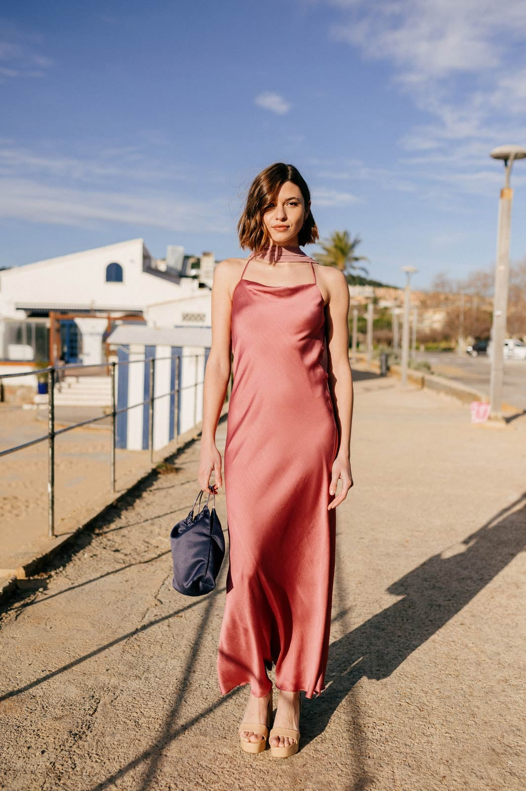 El Vestido Karlie es la definición de minimalismo sofisticado. Confeccionado en tejido ligero y vaporoso, presenta un escote halter que realza el cuello y los hombros, acompañado de una silueta recta y fluida que aporta elegancia natural. Su diseño incluye una capa transparente que añade movimiento y un efecto etéreo al caminar. Una pieza atemporal y refinada, ideal para eventos al atardecer o noches especiales junto al mar.